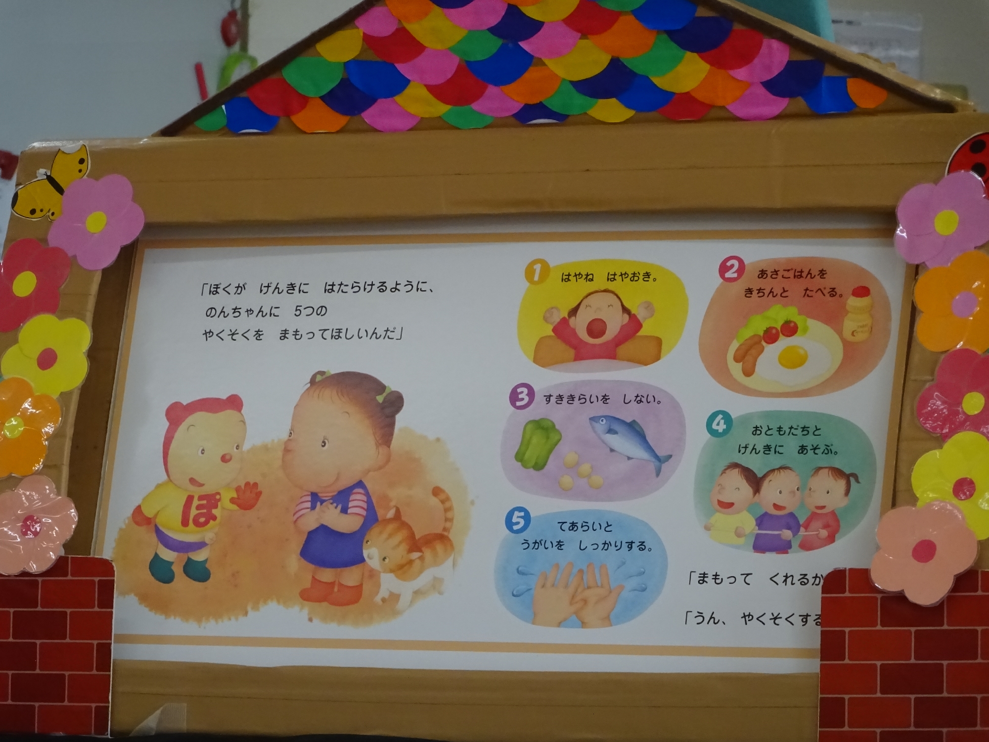 事前に絵本の読み聞かせで【5つの約束事】を知っていた子どもたちは、「おなかが元気になるお約束事、知ってる??」と質問されると、「うん!知ってる!!」「わかるよー!」と自信たっぷりで答えていました☆