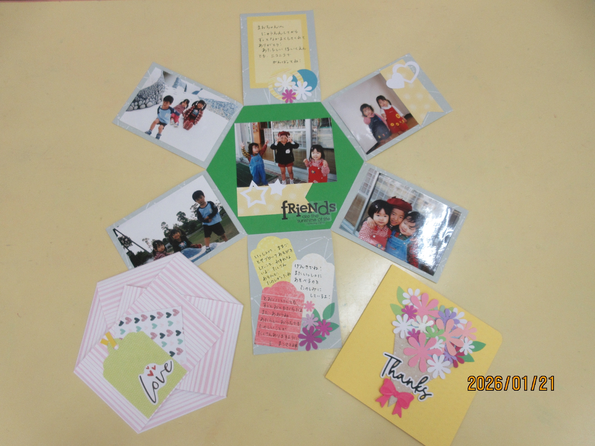 お子さんは保育士と一緒に遊んでいる間に、お父さん・お母さんは講師の先生と一緒に六角形カードを作ります。お土産に講師作成の花束カードがもらえます。